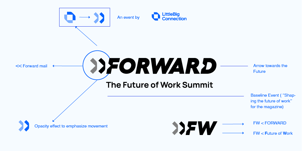 FORWARD is a BtoB event crafted by LittleBig Connection, designed for IT recruitment and sales experts to engage in discussions and gain insights into the Future of Work. Later that year, a magazine with the same name was launched. FORWARD’s brand design aligns with the tech world and seamlessly integrates into LittleBig Connection's brand. It cleverly plays with the letters FW (Forward/Future of Work), symbolizing a dynamic movement towards the future.