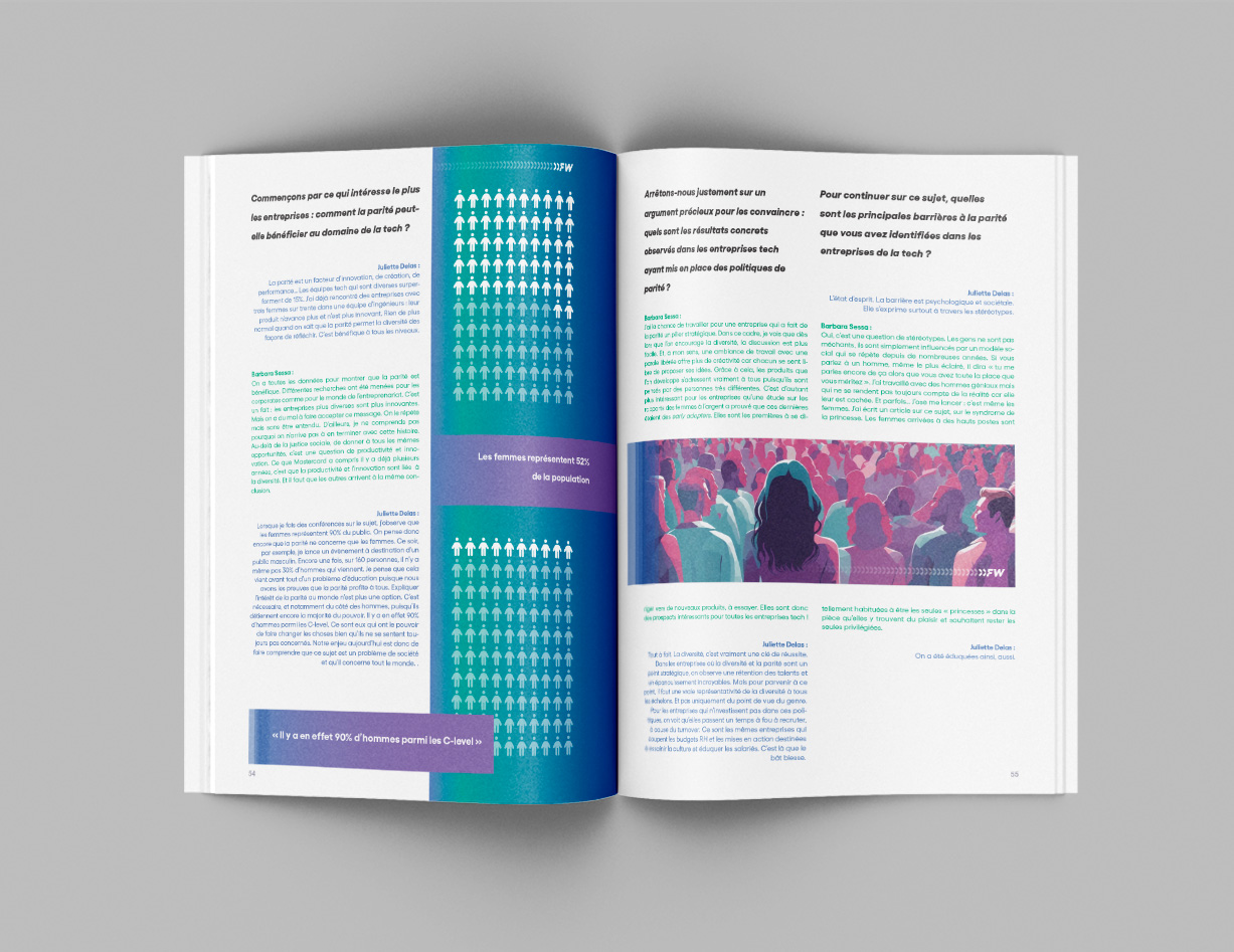 FORWARD is a magazine on the Future of Work, available in digital format (2 editions) and in print version (70 pages). Complete realization of the magazine, layout, & illustrations. Digital magazine downloadable ︎︎︎here. FORWARD originated as a BtoB event created by LittleBig Connection, complete visual identity ︎︎︎here.