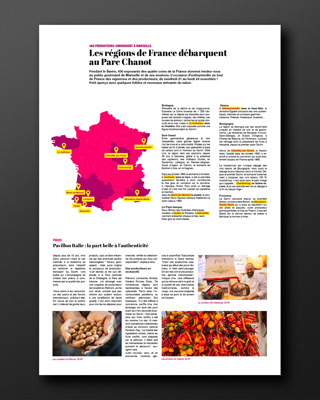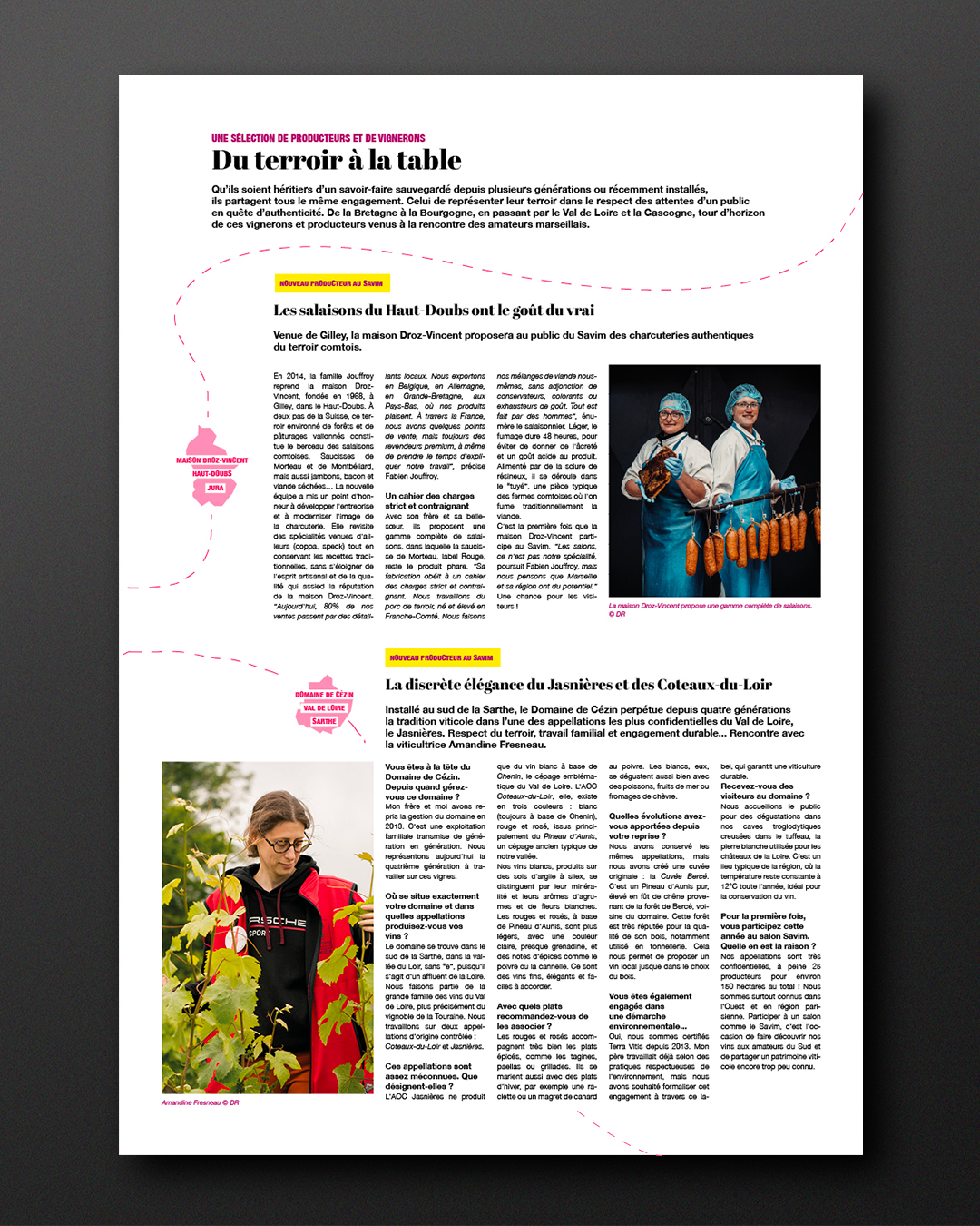 La mise en page met en valeur la diversité des producteurs et la richesse de leurs origines, en soulignant le fait qu’ils proviennent de toutes les régions de France. Les compositions ont été pensées pour le support presse, en conciliant lisibilité, impact visuel et contraintes d’impression.